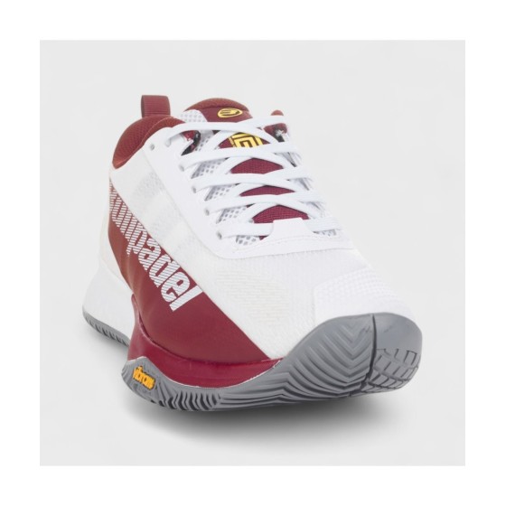 Bullpadel présente les chaussures de padel pour homme XPLO Vibram 25I en rouge et blanc, un modèle conçu pour les joueurs en quête de vitesse, de confort et de performance.