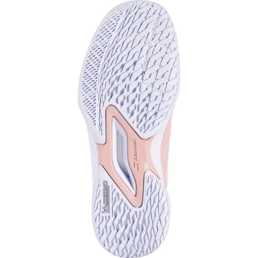 - Semelle extérieure Michelin : Inspirée des pneus de rallye, la semelle possède une excellente performance sur une plus longue durée. Forme et profil de la semelle, sculptures et formulation sont autant de variables qui font la force des semelles des chaussures Babolat.- Powerbelt : Ceinture allant de la semelle intermédiaire aux lacets les plus hauts afin d'apporter un maintien au plus proche du pied- Renfort sur l'avant-pied et au niveau des orteils pour plus de durabilité- Mousse EVA épaisse au talon pour plus d'amorti et de confort- Semelle non marquante